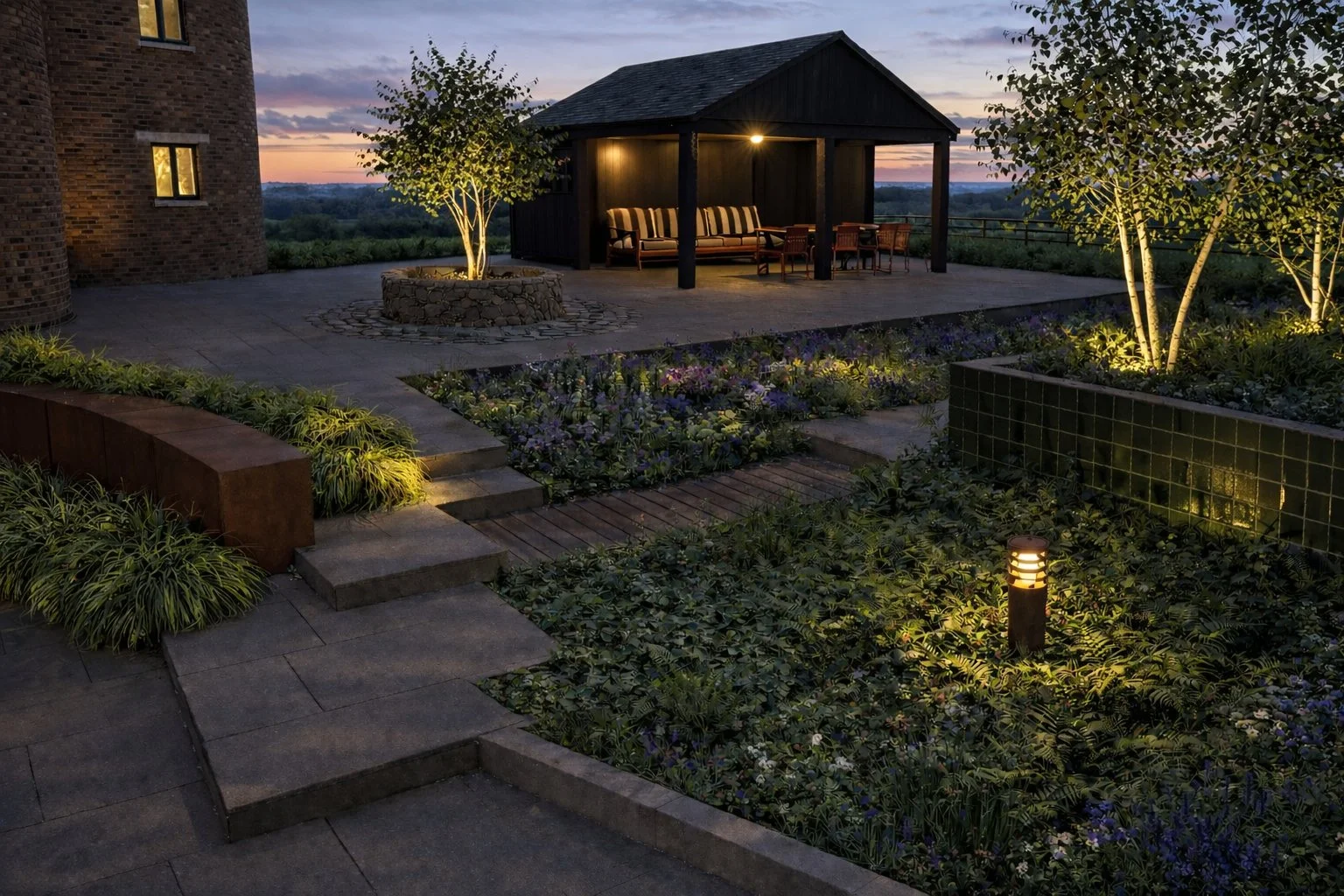 Planting of all trees & plants from your pre-agreed planting plan and installation of new furniture, light fittings and other accessories.